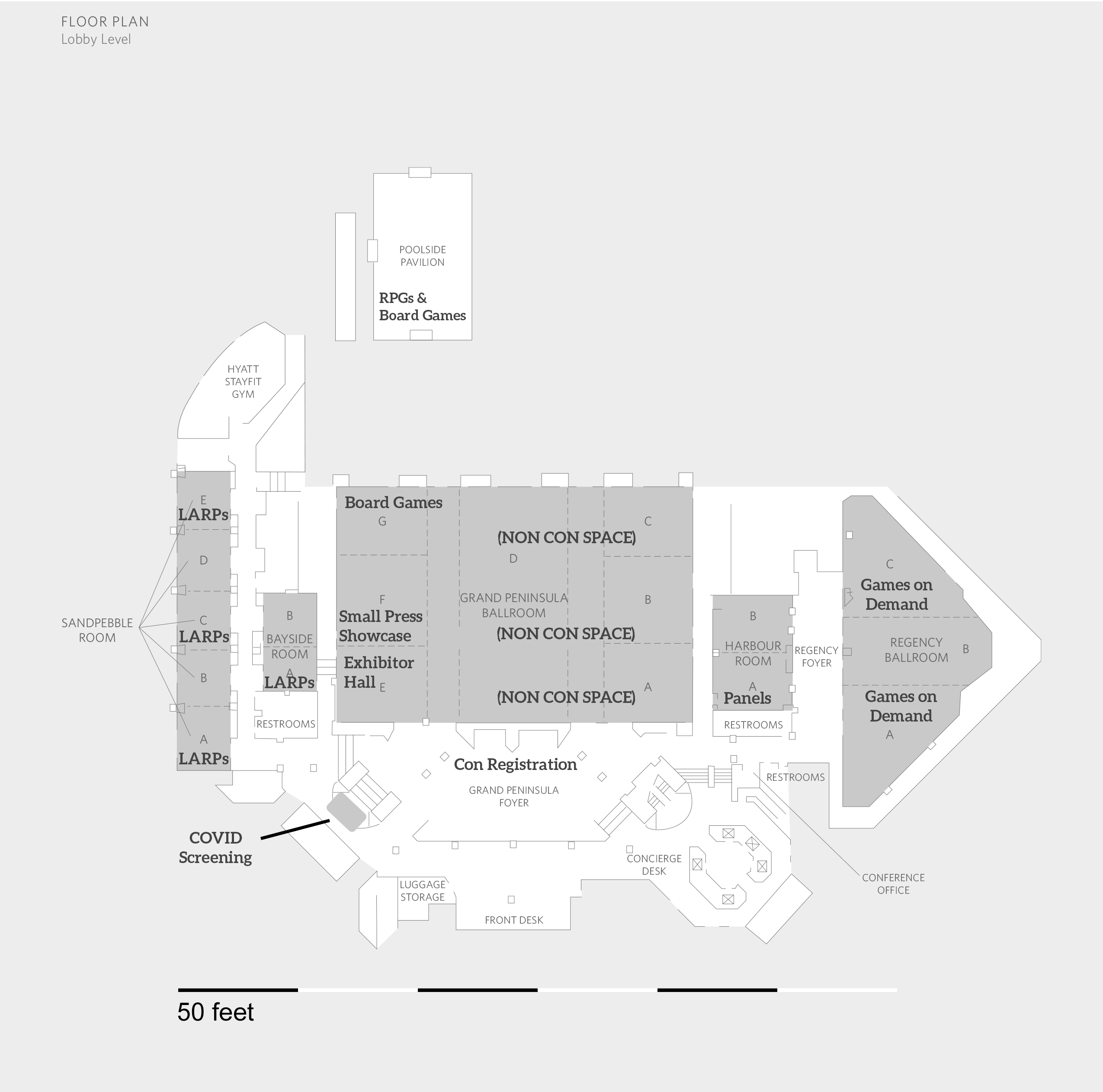 - Proceed to the COVID check-in table, located at the base of the south stairwell (map). Please don’t enter the Grand Foyer (where convention registration is located) or any other convention area until you first check in with the COVID screening team.